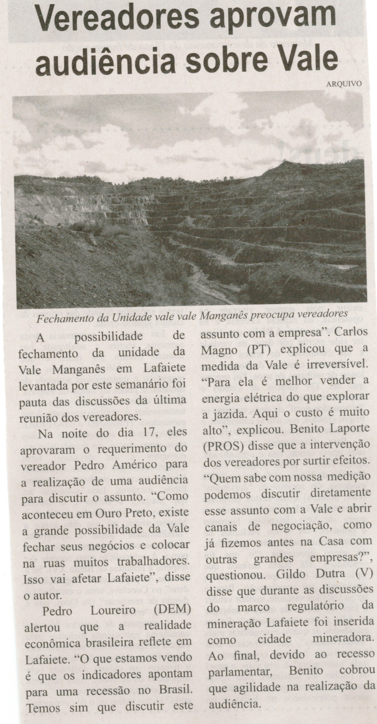 Vereadores aprovam audiência sobre Vale. Correio de Minas, Conselheiro Lafaiete, 18 dez. 2014, p. 5.