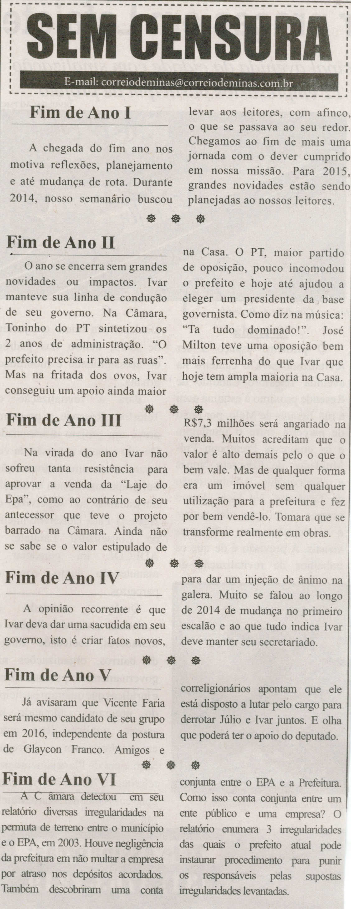Fim de ano VI. Correio de Minas, Conselheiro Lafaiete, 18 dez. 2014, Sem Censura, p. 3.